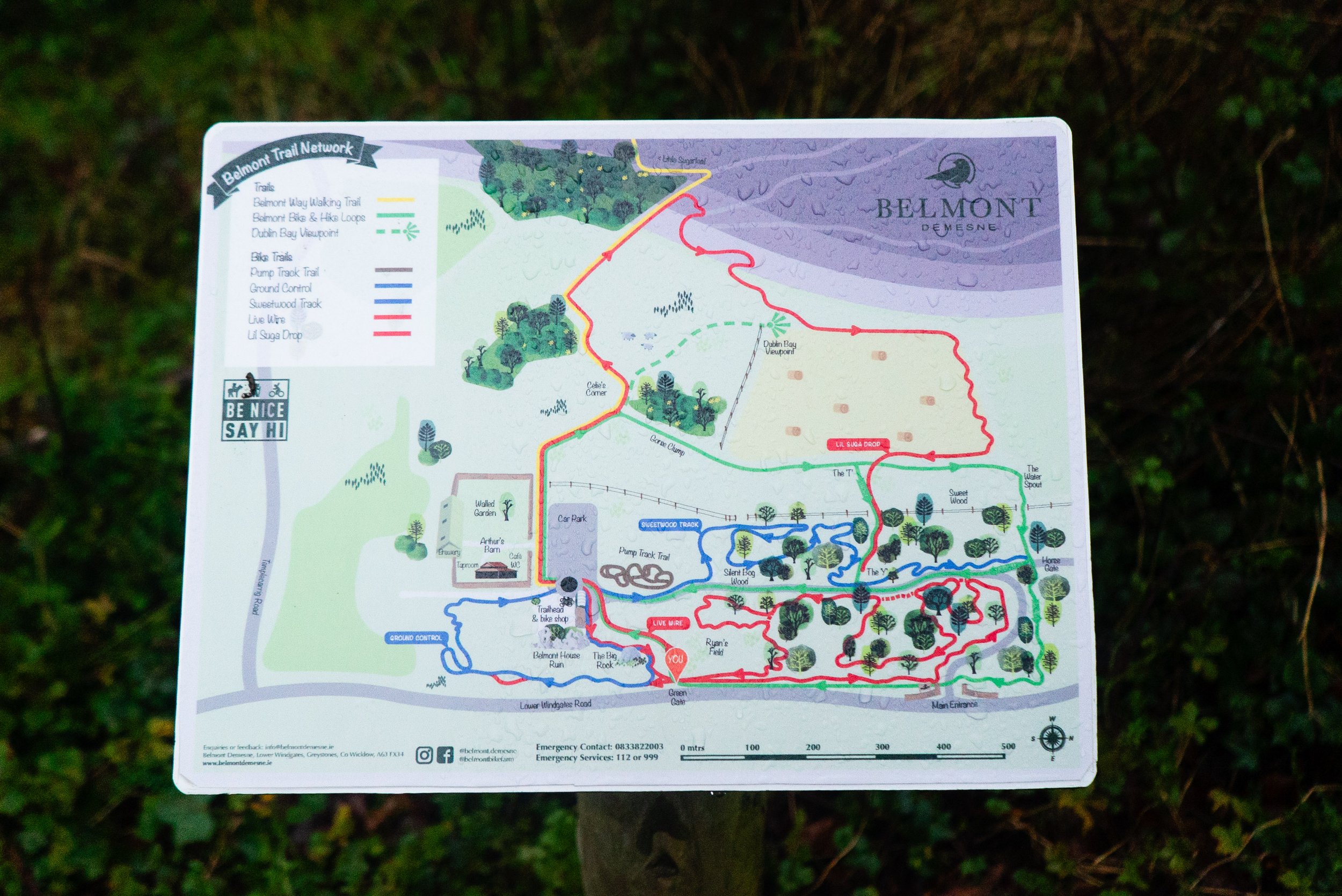 Starting from the easterly (Bray / Belmont) end of the trail, the first info-board is just inside the gates of Belmont Demesne. The first kilometre takes you from the gates to the Kitchen 28 Café at the main buildings. The walk is along some easy forest trails and well defined paths. I took shelter (and used the bathrooms, which were very clean and tidy) in the café while a particularly heavy shower hit. I got to meet the resident pup, who was much more fond of me once I procured a treat from the staff.
