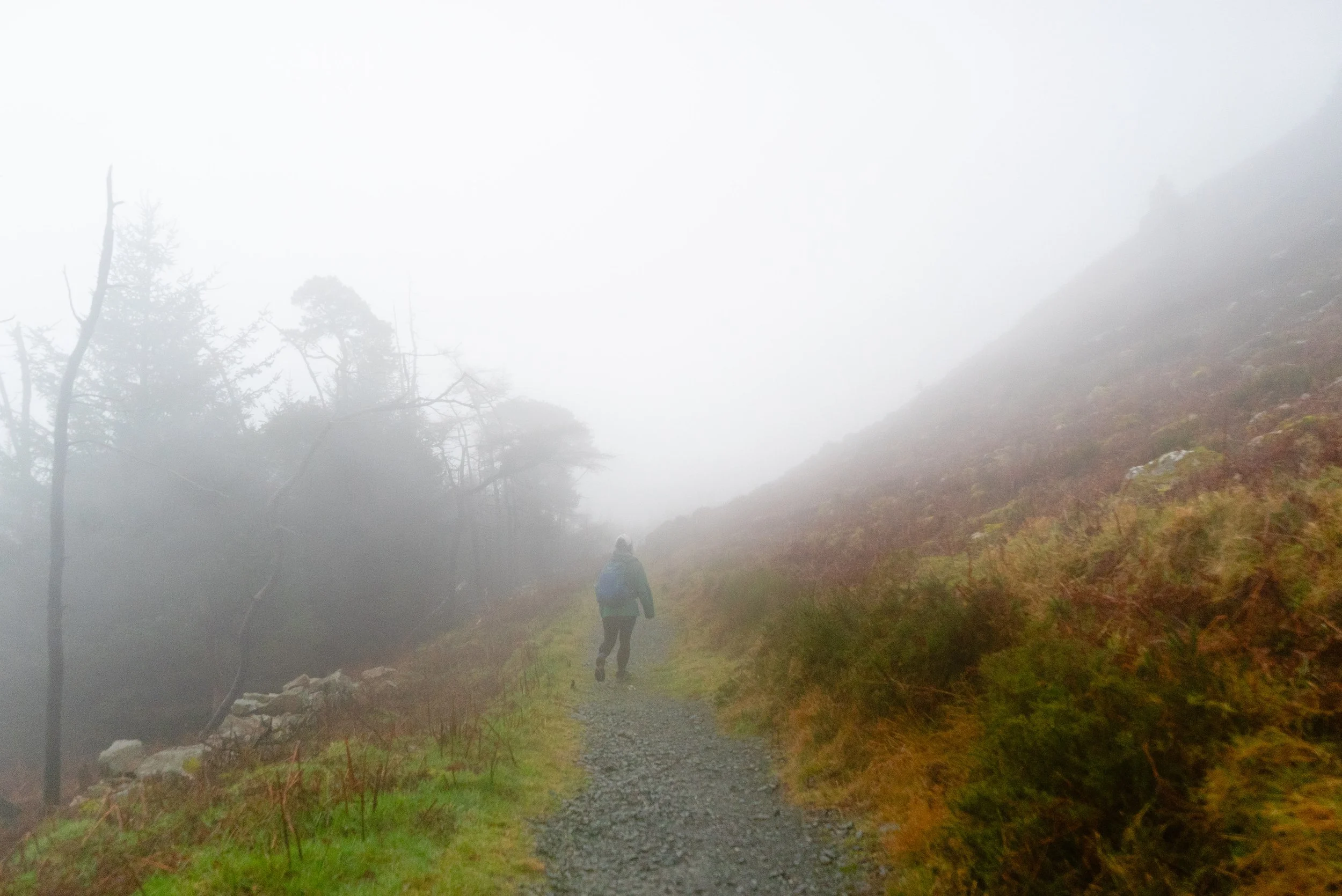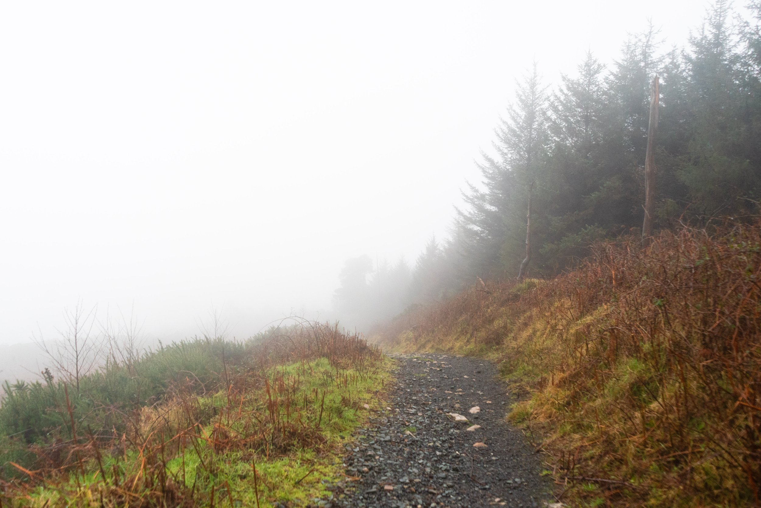The ground underfoot when on the Little Sugarloaf is very rocky and broken underfoot, but the path is still obvious. I had somewhat underestimated the intensity of this climb given how short this overall trail is. On a clear day, there would be some great views - particularly as you descend down the other side and look towards the Great Sugarloaf and Wicklow Mountains behind it.