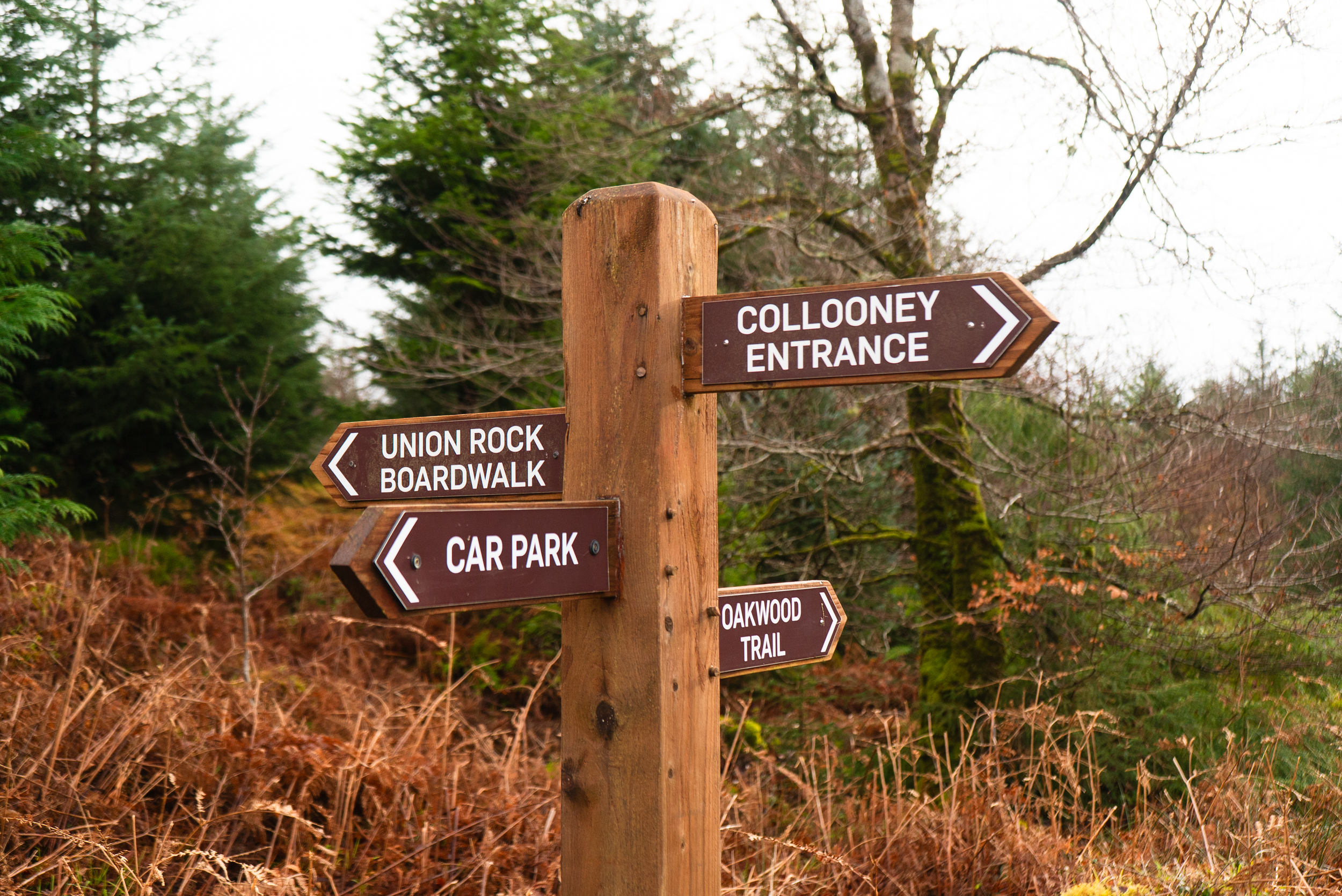 The Oakwood Trail follows green way-marking around the lower hills of Union Wood. This looped route is 5km long and takes you through the areas designated as a Nature Reserve (thanks to its SAC status) and managed by the NPWS.