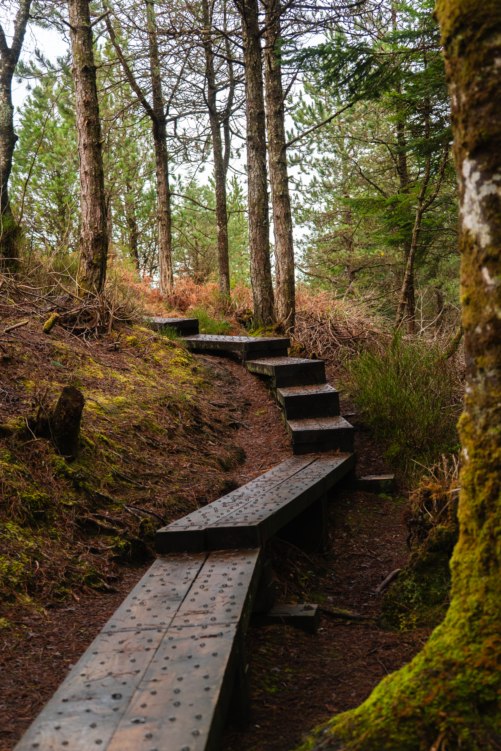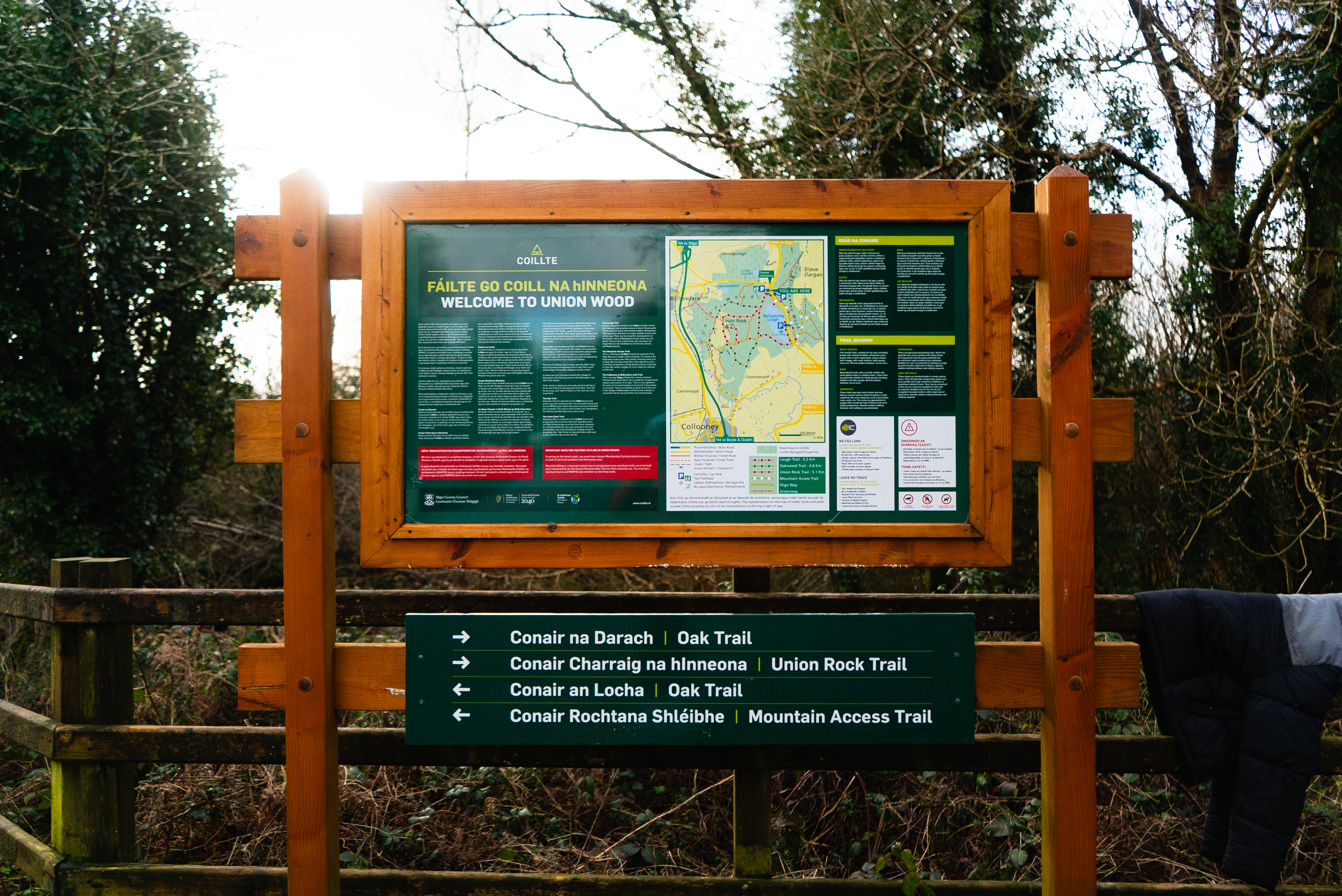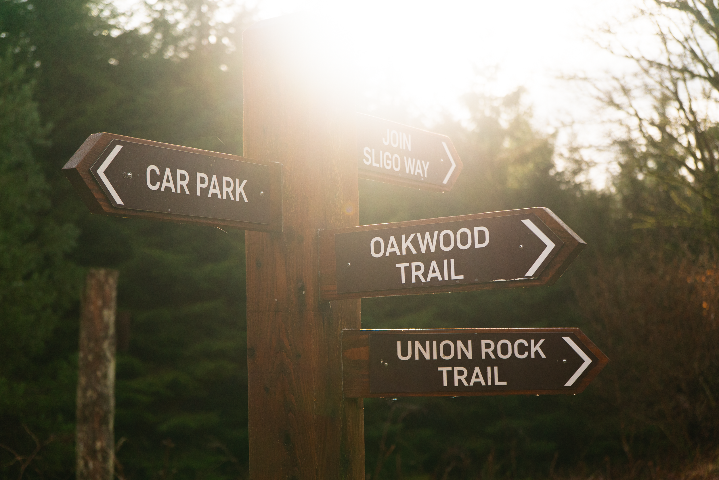 This route takes you in a spiralling loop around Union Rock, with a spur off to the summit. Following the trail from the main carpark, youβll head anti-clockwise around the hill, passing by some of the old oak forest. Once youβve made it most of the way around the hill, you will come to a wide Y-junction. If you want to take the boardwalk to the summit, you will have to turn uphill. If you want to stick to the wide gravel tracks, continue downhill. The summit views are gorgeous, taking in Knocknarea and the Ox and Dartry Mountains.